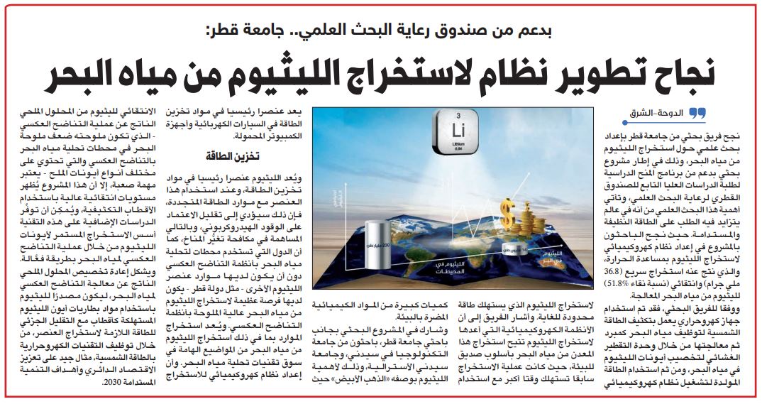 بدعم من صندوق رعاية البحث العلمي.. جامعة قطر: نجاح تطوير نظام لاستخرج الليثيوم من مياه البحر
