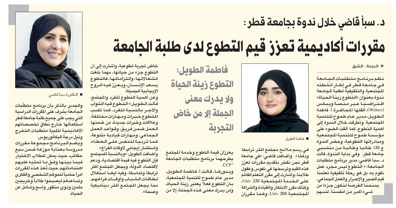 د. سبأ قاضي خلال ندوة بجامعة قطر: مقررات أكاديمية تعزز قيم التطوع لدى طلبة الجامعة