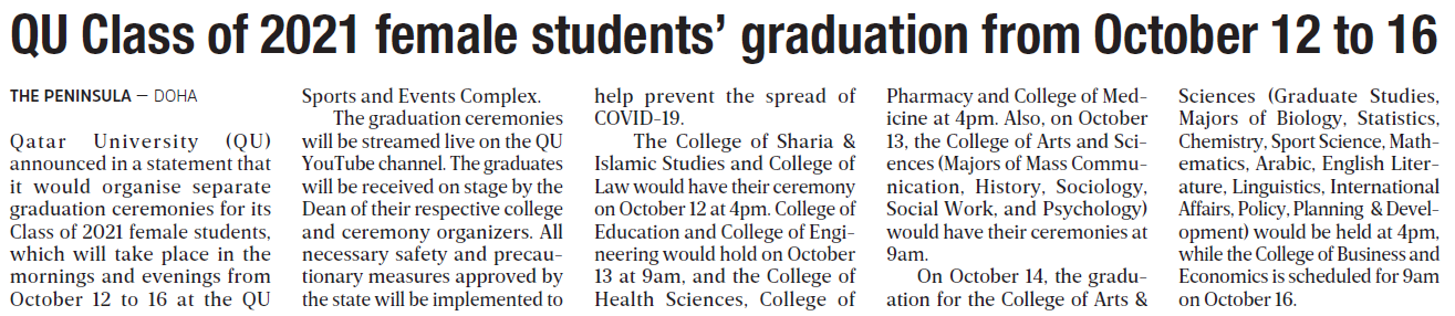 QU Class of 2021 female students’ graduation from October 12 to 16