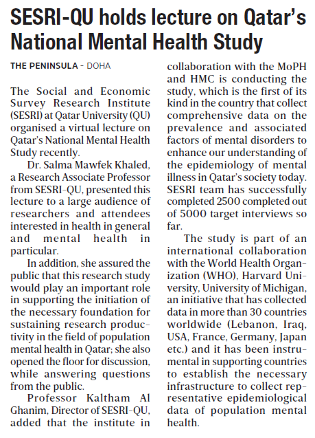 SESRI-QU holds lecture on Qatar’s National Mental Health Study