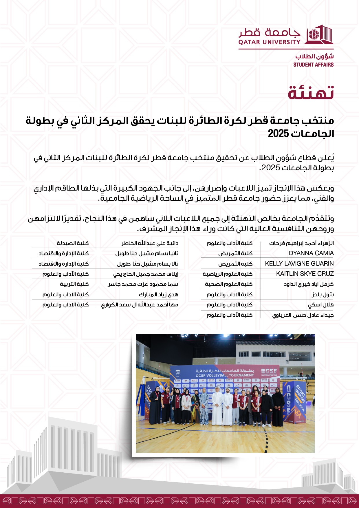 منتخب جامعة قطر لكرة الطائرة للبنات بحقق المركز الثاني في بطولة الجامعات 2025