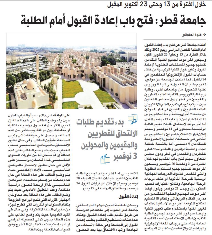 جامعة قطر: فتح باب إعادة القبول أمام الطلبة