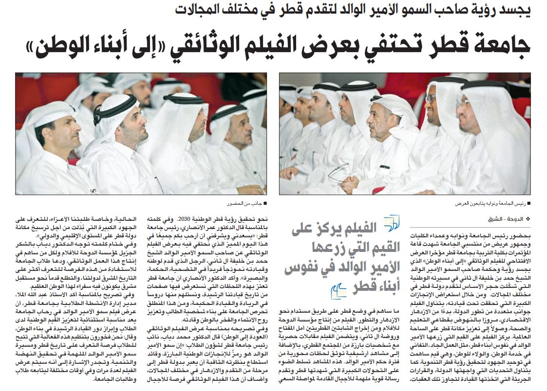 "جامعة قطر تحتفي بعرض الفيلم الوثائقي "إلى أبناء الوطن