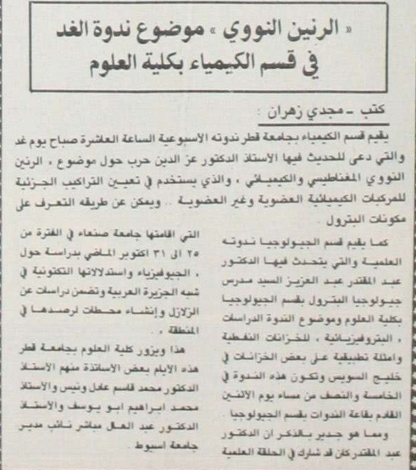" الرنين النووي" موضوع ندوة الغد في قسم الكيمياء بكلية العلوم
